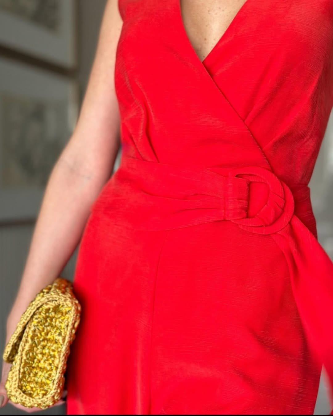 Macacão em crepe estruturado com decote em V, alças largas e cinto self-tie com fivela forrada – modelagem que realça sua silhueta com toque sofisticado e vibrante.